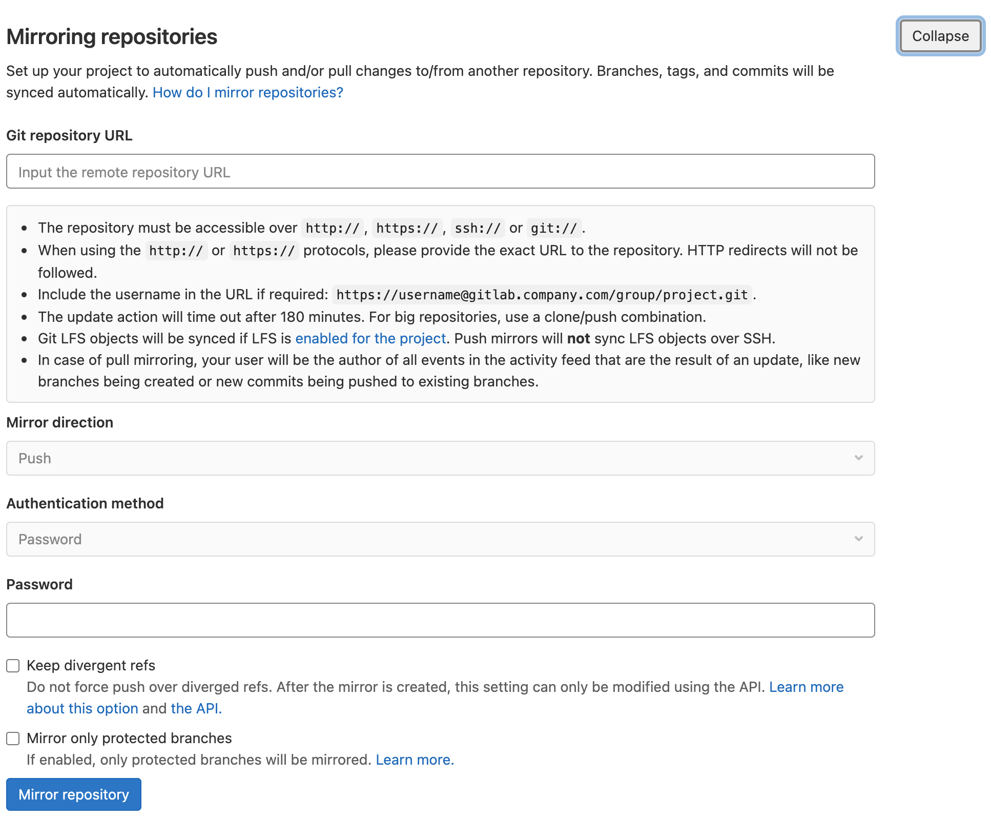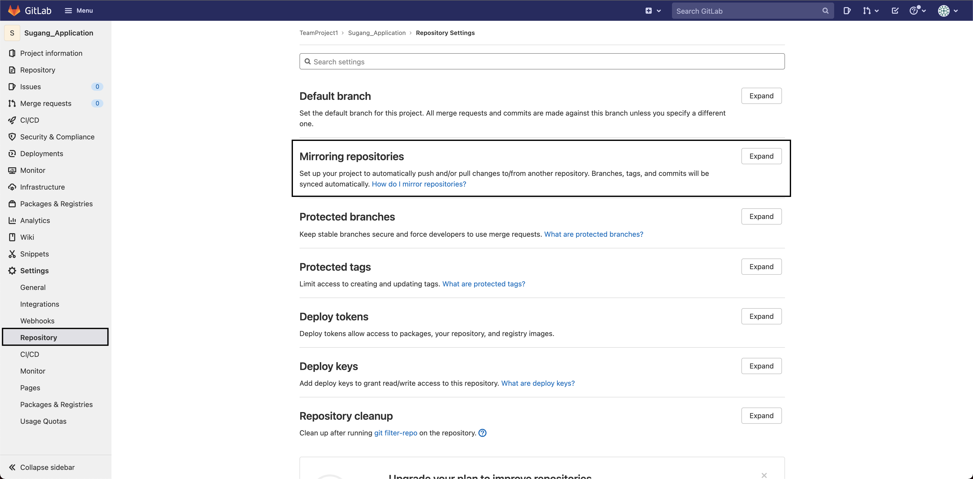 해당 메뉴를 클릭해서 보이는 Mirroing repositories 옆에 expand 버튼을 클랙해줍니다.