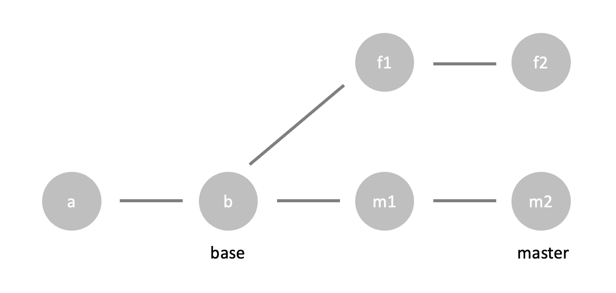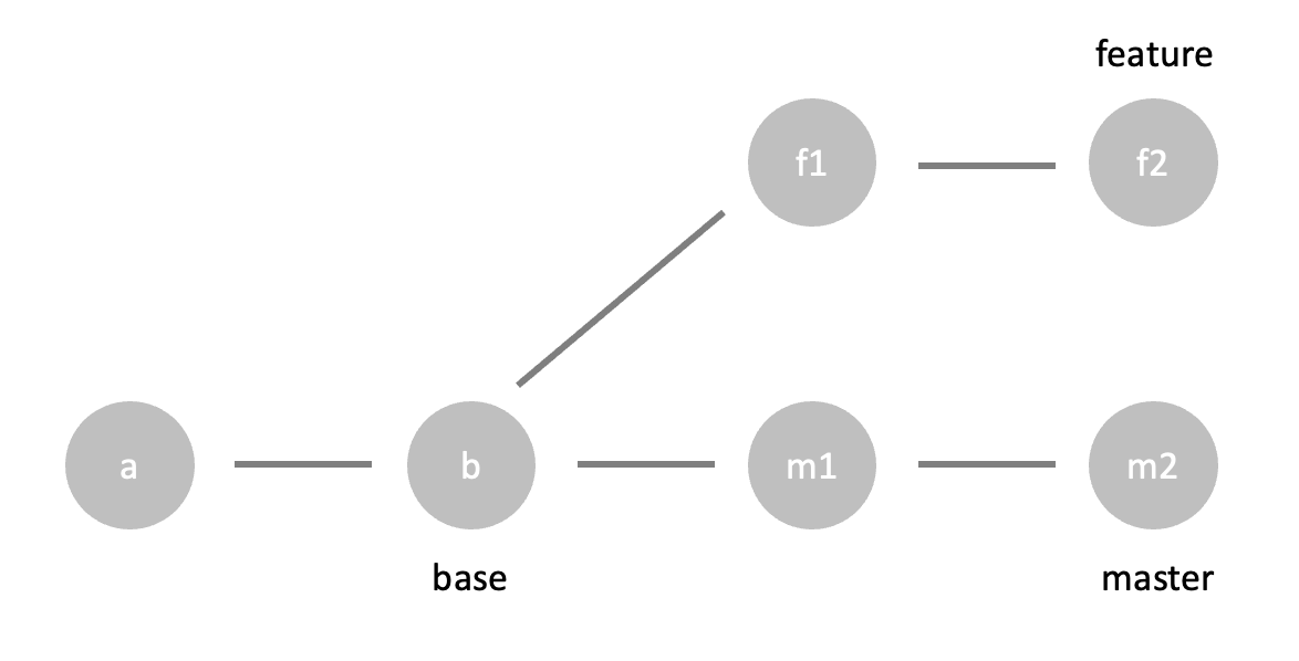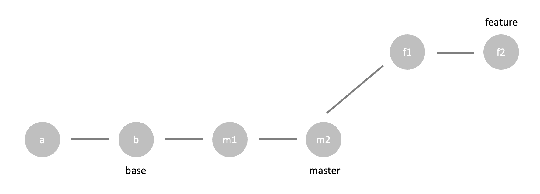 merge 브랜치에서 사용하는 전략은 각 브랜치의 마지막 커밋 두 개와, 공통 조상의 총 3개의 커밋을 이용하는 3-way mere를 수행하여 새로운 커밋을 만들어내는 것입니다. 다음 그림에서 보이는 feature와 master의 마지막 커밋은 각각 f2와 m2, 그리고 공통 조상 커밋 b 입니다.