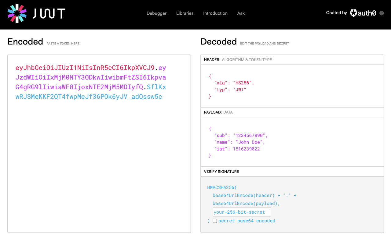 토큰을 인코딩하거나 유효성 검증을 할 때 사용하는 고유한 암호화 코드입니다. 서명은 위에서 만든 헤더와 페이로드의 값을 각각 Base64로 인코딩하고, 인코딩한 값을 비밀키를 이용해 헤더에서 정의한 알괼즘 해싱을 하고, 이 값을 다시 BASE64로 인코딩하여 생성합니다.