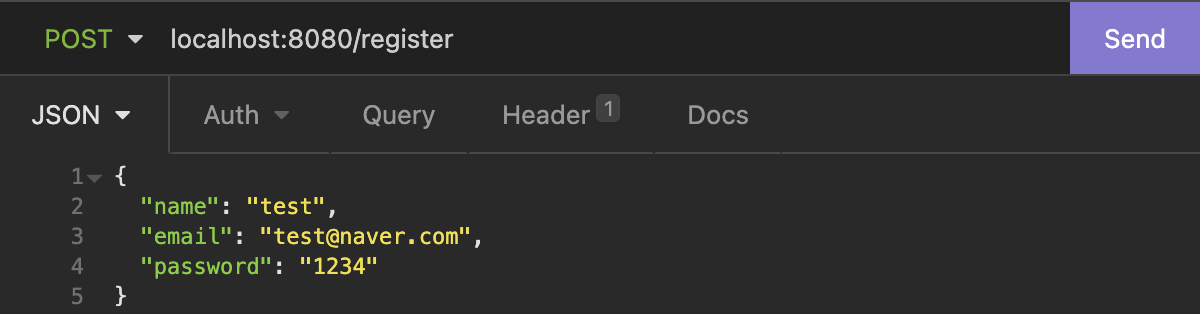 localhost:8080/register에 POST 요청으로 회원가입하고 싶은 이메일 주소와 비밀번호를 전송합니다.